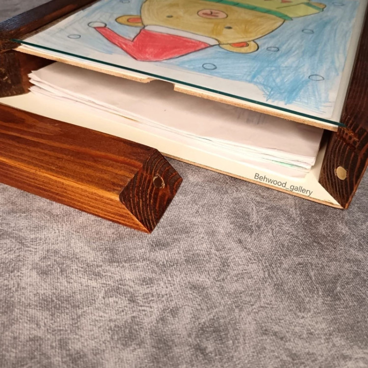 قاب نقاشی کودک بهترین وسیله برای نگهداری نقاشی کودکان است که علاوه بر افزایش اعتماد به نفس و خلاقیت در کودکان بر زیبایی اتاق کودک نیز می افزاید. این قاب برای نقاشی سایز A4مناسب است و قسمت مخزن آن گنجایش بیش از 50 ورق را داراست. درب این محصول به وسیله مگنت بسته میشود و قابل سفارش به صورت افقی و یا عمودی میباشد. در قسمت پشت کار دو قلاب نصب شده که به راحتی میتوان بر روی دیوار نصب کرد.